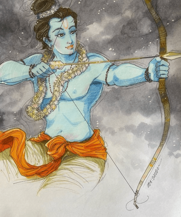 As the large army of khara converged on rAma, he sent sItA away to safety along with an armed and alert lakshmaNa. And then putting on the armor, with great enthusiasm and determination he got his bow ready. He welcomed the enemy with a twang of the bow that reverberated throughout the forest and in the hearts of the enemy warriors! As the thousands of the warriors surrounded him and hurled at him everything at their disposal, rAma launched series of arrows to counter the rain of weapons from the enemy side. He was hit by a few and was bleeding, but he was neither deterred nor afraid. He changed the bow to a circular stance (manDala AkAra) and rained arrows to both counter the weapons hurled by the demons and also to get them. Soon they were tormented by the unceasing flow of arrows emerging from rAma’s bow coming and hitting them with alarming speed. One moment they saw rAma aiming and the next thing they knew was they were being hit out of their lives! The collective vision of the demons was such that they saw in the darkness created by the swathes of arrows blocking the sunlight, it appeared as if one rAma was spitting out the arrows at them unerringly. Thus in no time at all, rAma vanquished a large part of the army. Those who survived ran for their lives to khara to report them matter and seek protection. Onwards…