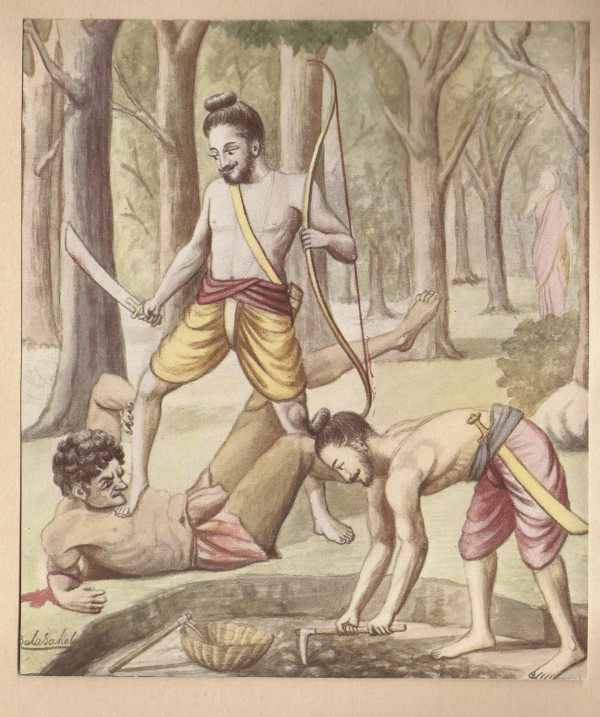 Upon rAma’s instruction lakshmaNa fetched a spade and dug a pit large enough to bury the dead demon virAdha. Once the pit was ready, rAma removed his feet from the throat of virAdha and the two brave brothers joyously threw the body of the demon into the pit and fearlessly covered the pit with stones. The dying roar of virAdha reverberated in the forest.