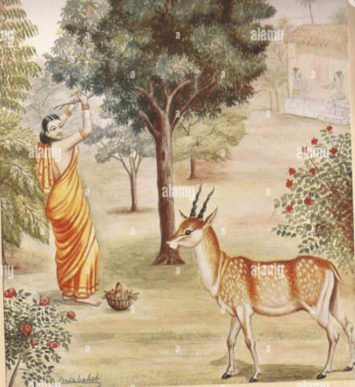 At the same time, sItA, the one with auspicious looks, came out near the mango and the karnikA trees with the intention of plucking flowers. She moved around there gathering the flowers. That sItA, totally undeserving the stay in a forest, per chance glanced upon the bewitching deer bedecked with gems and sporting colorful spots. She cast affectionate looks at it in a sense of complete wonder. That darling of rAma, sItA beheld the hitherto unseen brilliant beast that seemed to be setting the forest bright with its illumination and was taken by total surprise.