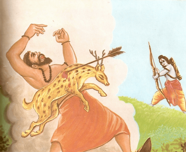 He set the radiant arrow created by brahma on his mighty bow, took aim at that particular deer and unleashed it and the arrow went hissing like a serpent. The unerring arrow pierced into the heart of mAricha in the form of the deer. Hit by the powerful arrow, mAricha was thrown up in the sky as high as a palm tree and then fell down on the ground nearly dead and shed the guise of the deer that he had donned. As his life force escaped him, he remembered the words of rAvaNa about fetching lakshmaNa also out of hermitage to facilitate the abduction of sItA. In those dying moments, mAricha realized that to be the appropriate time to put the scheme into further action and imitating the voice of rAma cried out loudly alas sItA, alas lakshmaNa.