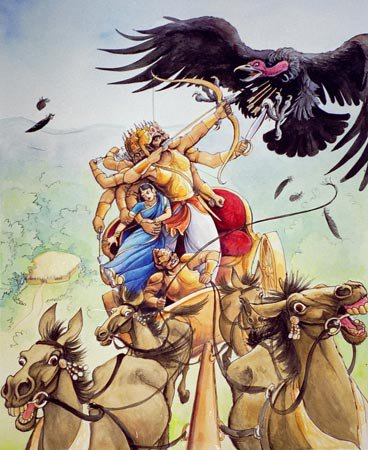 Using the claws, nails and the beak as his weapons, the unarmed jaTAyu made a daring assault of rAvaNa and pulled his hair while perched on his back. rAvaNa was livid at this persistent attack by the vulture and in raging anger held sItA with his left arm and hit jaTAyu with his fist. The lord of the birds jaTAyu, with his beak cut off rAvaNa’s ten left hands and as the ten left hands fell off, there came out ten more like the serpents spitting venom from the anthill! Then leaving sItA aside, rAvaNa angrily fought jaTAyu with his hands and feet. Thus among the unequals, the best of the birds and the chief of the demons, the combat lasted a while. And then taking his sword out rAvaNa cutoff the wings and feet of the bird who was fightinh relentlessly for the cause of rAma. With his feet and the wings clipped of by the terrible demon, the giant vulture fell down on the ground with little life left in him. rAvaNa beheld the valiant jaTAyu fallen on the ground and felt as if a raging forest fire has been put out.