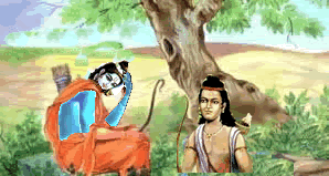 Overwhelmed by the sorrow of not seeing sItA, the beautiful lotus-like eyes of the righteous and mighty rAma shed copious tears. Smitten by the love-god, rAma hallucinated as if he was seeing sItA behind a tree even though she wasn’t there and spoke incoherently –