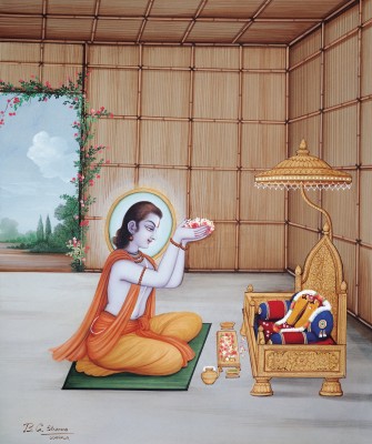 His subordination to the symbol of rAma was complete, any issue howsoever small was first submitted to them and then only acted upon. Any valuable gift that was offered was first submitted to rAma’s sandals before accepting and thus he administered ayOdhyA in complete surrender to rAma.