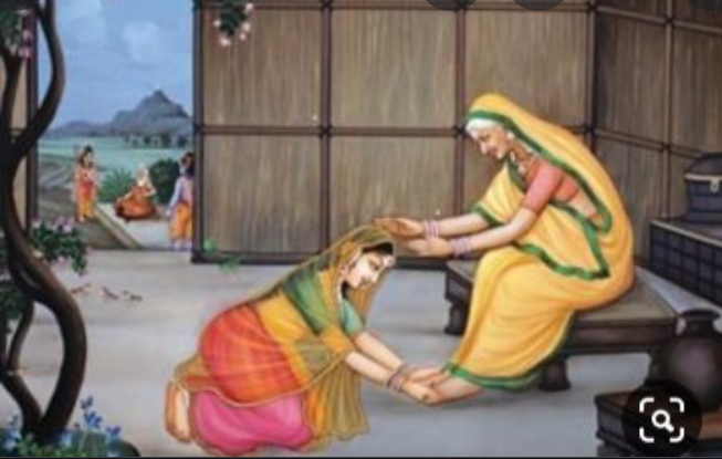sItA agreed and at once went to meet mother anasUyA. The old lady was feeble, had wrinkled skin, with fully greyed hair on top of her head and was trembling of ripe old age like the plantain tree would in the face of the wind. sItA fell at the feet of such a graceful woman, circumambulated her and greeted her by saying out her name aloud [it is customary to greet elders by specifying full details of one’s ancestry and name, called pravara]. Then with folded hands vaidEhi (sItA) enquired her wellness. Then mother anasUyA beheld sItA delightfully and spoke kindly –