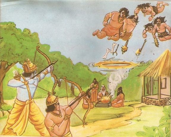 The sages of the hermitage were thrilled at the eagerness and resolve of the princes to fight the demons. They replied, “O princes, from today, for six days the yajna will be on and during this time the brahmarshi observes the vow of silence. The yajna needs to be protected for these six days and nights”. The two illustrious princes prepared to protect the yajna for six days and nights at a stretch without sleep. The heroic wielders of the best bows and destroyer of the enemies kept strict vigil such that the yajna continued without obstruction.
