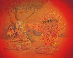 The great kapila looked at them and angrily uttered a menacing sound (h-u-m) and the sixty thousand sons of sagara at once reduced to heaps of ashes.