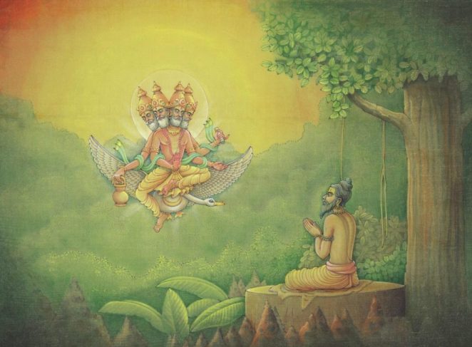 In spite of being desirous of progeny, bhagIratha didn’t opt for that but was instead determined about the descent of ganga. He was a rAjarshi – a king and sage at the same time! Early on in his rule, he gave the administrative responsibilities of the state to his ministers and himself moved to gOkarna where with upraised hands and surrounded by fire he performed rigorous penance eating only once in a month and being in complete sense control. As he continued with his terrific penance for a thousand years in that manner, the lord brahma was pleased and appeared before him.