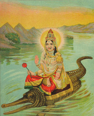 Following bhagIratha ganga reached the ocean and from there the nether regions where the sons of sagara lay as heaps of ashes. As the heaps submerged in ganga, lord brahma manifested in front of bhagIratha and confirmed to him that his forefathers have attained salvation and attained heavens and that they shall dwell there as long as there is water in the oceans. He said, “ganga is your elder daughter and will be famously known as bhagIrathi after you. By virtue of her trifold flows in the heavens, earth and the nether worlds, she shall be known as tripathaga. You may offer ablutions to your forefathers here and fulfil your vow to bring ganga down from the heavens. O dear son anSumAn, your feat is unrivalled by your father and grand father. Inspite of his maharshi like splendorous qualities and supreme austerities your father dilIpa couldn’t achieve this. Hence you have achieved great renown and reverence by this act of yours”. With those pleasing words, exhorting bhagIratha to take a holy dip and perform the funeral rites of his forefathers lord brahma withdrew to his abode.