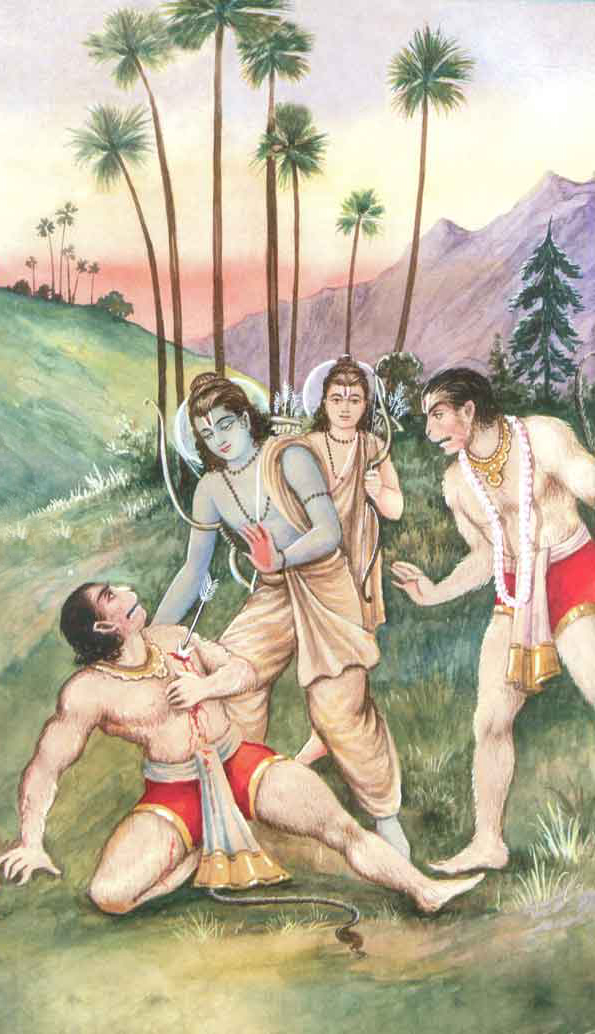 A furious vAlI rushes out of his inner chambers when sugrIva roared thunderously to challenge him. But his beloved wife tArA intercepted him and offered wise counsel. She estimated accurately that there must be a great force behind the diligent sugrIva which encourages him to challenge him so soon after being beaten squarely by vAlI. She further quoted intelligence information from angada about the friendship between sugrIva and rAma. But vAlI had made up his mind to teach sugrIva a lesson for this affront. So he brushed tArA aside and the two brothers engaged in combat. They rained blows on each other, bled profusely and in due course, vAlI seemed to stay course and gain ground while sugrIva seemed to be taking a beating. He began looking for the assurance of rAma coming to fruition. Recognizing his need for help, rAma, got his bow ready and unleashed an unerring and fatal arrow aimed at vAlI. The twang of the bow reverberated across the forests and scared the birds, beasts and vAnaras. The arrow went straight and hit vAlI’s chest like thunder. At once, the mighty vAlI fell down on the earth like a mighty tree uprooted by mightier winds. Onwards…