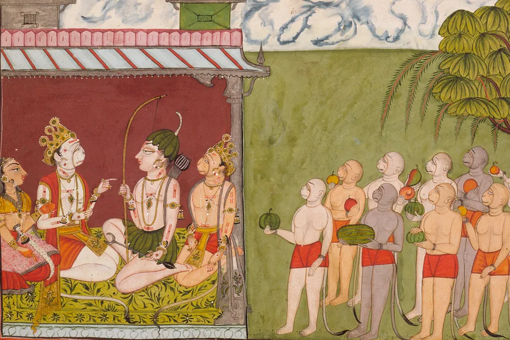 Unable to tolerate rAma’s hurt arising of the offence of sugrIva committed through indifference, lakshmaNa flew into a rage. Left to himself he would finished sugrIva. But rAma calms him down and asks him to think of the good that sugrIva did earlier and spare him with a stern reminder. The younger brother clamed down, nevertheless possessed the anger of rAma and set off for kishkindhA. Leaving aside the usual route and taking a shortcut, pulverizing stones and boulders that came his way and cutting off the branches that obstructued, lakshmaNa quickly reached the cave city and that scared away the vAnaras who were standing guard to the city. Soon he met angada and asked him to convey the message of his advent to sugrIva. The king if vAnaras was lost in luxuries and sensual pleasures and initially the gravity of the situation didn’t dawn upon him. And then lakshmaNa advanced angrily towards the inner chamber in the palace and stopped only when he notice frolicking women and was embarrassed a bit! Retreating to solitude near the inner chambers, lakshmaNa twanged his mighty bow and that shook up everyone and woke up sugrIva from his slumber. He immediately conferred with his council and thought it best that the articulate and astute tArA first brought the temperature down and then he could deal with lakshmaNa. He was confident that the gentleman of great conduct, lakshmaNa won’t behave rudely with tArA! As it turned out, sugrIva’s reading was correct. lakshmaNa was a tad unprepared to encounter tArA in this mision! She welcomed him warmly and spoke affectionately, occasionally carried away by the floating senses under the influence of the drinks! But she was very controlled and combining both a criticism and considered praise for sugrIva, she calmed lakshmaNa down. Since lakshmaNa was self restrained and had no business with sensual pleasures, he was welcomed into the inner chambers of sugrIva where the vAnara king was surrounded by the womenfolk like the moon accompanied with the stars! Onwards…
