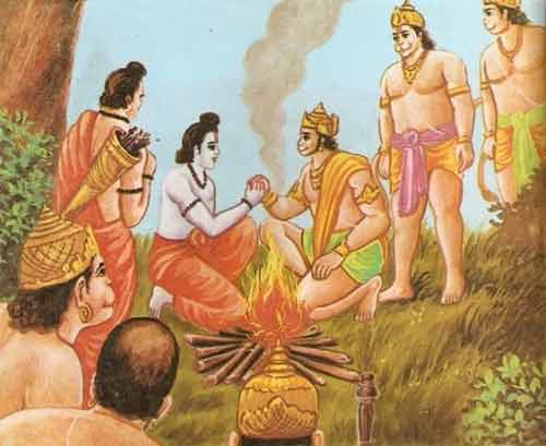 Seeing this, hanumAn who had given up the guise of the mendicant and assumed his natural form, gathered fire wood, generated fire by rubbing the wood and having worshipped the agni (fire) duly, he placed it between rAma and sugrIva.