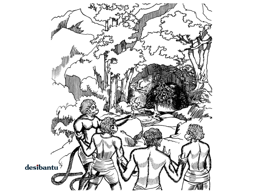 It was a large networked effort, well coordinated among hanumAn, gaja, gavaksha, gavaya, Sarabha, gandhamAdana, mainda, dvivida, sushENa, jAmabvAn, nala, prince angada and tAra. They mounted a sterling effort in the range of mountains in the southern direction and thoroughly searching there, they found a large cave by name Rkshabila which was being guarded by a demon. All of them were troubled by hunger and thirst, were tired and pined for water. In such a state, they found the giant cave covered with creepers on it. Their excitement and bewilderment was enhanced as they saw krauncha, swans, geese and chakravAka birds, drenched in waters and feet covered with red lotus pollen flew out of the inaccessible and the fragrant cave!