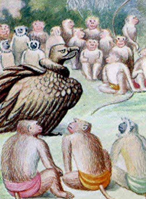 As the vAnaras squatted on the slopes of that hill, the long lived vulture by name sampAti, known for his might and courage, the brother of jaTAyu [3.51. Call him hero, call him loyal, call him jaTAyu!], emerged from the cave on that mountain of vindhya and came there. Beholding the squatting vAnaras, he was absolutely delighted and said –