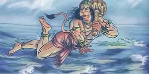 Having felled the ogress with his great grip, firmness and ingenuity, hanumAn again assumed his giant form. With her heart torn by hanumAn, the ogress simhikA miserably fell into the sea. The sky faring beings witnessed this and immediately told hanumAn that a terrific deed has been accomplished by him in felling this mighty ogress. They wished him well in continuing his mission.