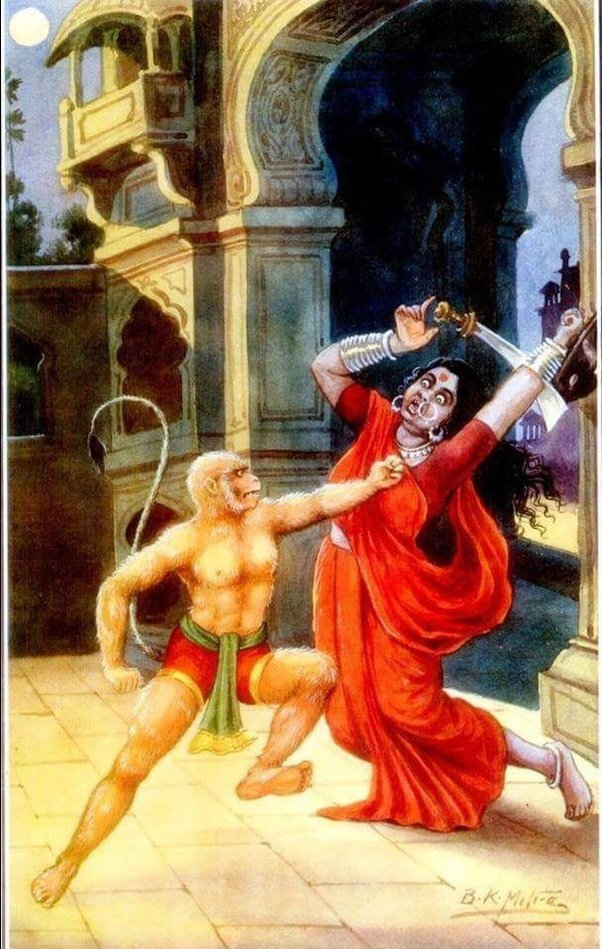 hanumAn gently insisted to her that he shall go back the way he came after seeing around the city. At this, the lanka deity got livid, let out a loud roar and struck the best of the vAnaras with her palm. The great vAnara, at this slap, let out a loud and valorous roar, in controlled anger, clenched the fingers of his left hand into a fist and hit her back. Considering that she was a woman, he did not go all out to thrash her.