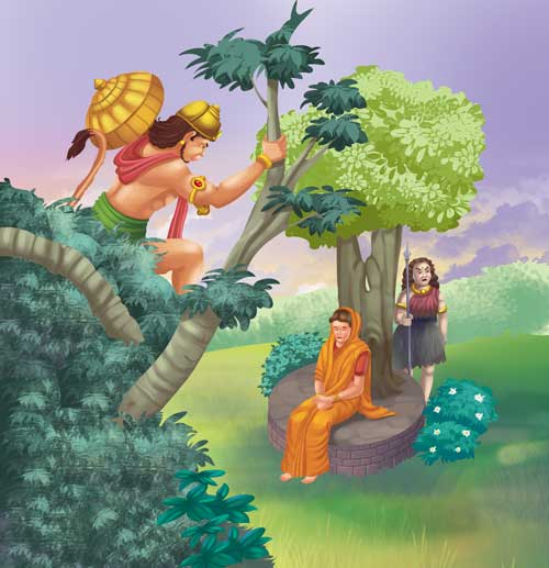After a flight of amazing resolve, hanumAn reached lanka and thoroughly scanned every inch of it to find the whereabouts of sItA. He covered the houses of ordinary citizens, who’s who of lanka and finally the private chambers of rAvaNa and could not find sItA. Fighting both disappointment and moral dilemma, hanumAn successfully wards off suicidal thoughts and resolves again to search for sItA in the sylvan aSOka grove. He feels very much at home in that grove and perched on a tree, he awaits the vision of sItA. Sure enough, he spots her soon in the middle of the aSOka trees, surrounded by many a crooked and menacing ogress whose job was to make her agree to rAvaNa’s proposal through coaxing or threatening. Her sArI was soiled due to prolonged usage. She was unkempt and yet, deep in the contemplation of rAma, she was radiant. In many ways, hanumAn deliberated to ensure that she indeed was sItA. Her grief seemed saintly and not one of sulking. She was unmindful of either the dangers of the demonesses or the beauty of the gorgeous grove. She was focused on rAma and fought grief in his thought, waiting for him. The vibes were strong that she was indeed sItA who was being forced in this grove to agree to rAvaNa’s proposals. How will he approach talking to her? Onwards…