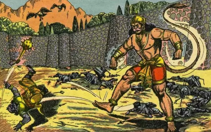 He summoned eighty thousand of his force each of whom were as mighty as him and ordered those irrepressible demons to go and rein in hanumAn. The very mighty eighty thousand battle mongers, armed with clubs and hammers, terrifying and dreadful in their appearance, sporting large canines, very eager to fight left the palace to capture hanumAn. They ran towards hanumAn who was waiting for them on the arch like the fireflies approached fire. They surrounded hanumAn with upraised arms comprising maces, spears, javelins, hammers, clubs and shining arrows.