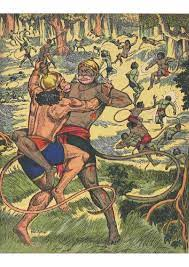 Assured by their leader, the guards headed back to the grove along with dadhimukha. On the way he armed himself with a tree and with the guards picking up boulders, trees and peaks, they charged at the vAnara angrily. The vAnaras ran to where hanumAn and angada were and dadhimukha with the guards chased them. Prince angada immediately got up and held dadhimukha who was charging at them with a tree in hand. He arrested his charge and not caring or remembering the fact that elderly dadhimukha was a grandsire for him, he threw him down. In this scuffle dadhimukha was injured and bleeding he lost senses for a while. Quickly gaining his senses, he chased the drunk vAnaras again but couldn’t punish them.