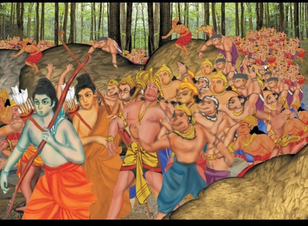 Scaling mighty mountains, they roared loudly, with the speed of their thighs and chest, many creepers and trees were dislocated. The gigantic army moved through the night and day thus, in utter joy and enthusiasm to engage in battle. Eager to make sItA free from captivity no one rested anywhere for even a small while.