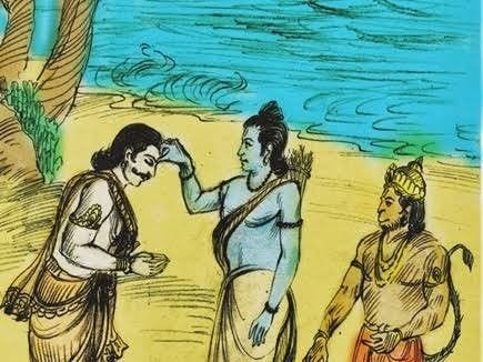 Responding to rAma’s assurance, the dhArmic vibhIshaNa bowed his head and assured that he will join the ranks of the army and help in the vanquishing of the demons and the siege of lanka. rAma was delighted to hear this and with full of affection asked lakshmaNa to fetch waters from the ocean and coronate vibhIshaNa right away. Thus ordered, lakshmaNa immediately brought water from the ocean and in full view of the vAnara army consecrated vibhIshaNa by the order of rAma. The vAnaras were delighted to witness this and hailed this”.