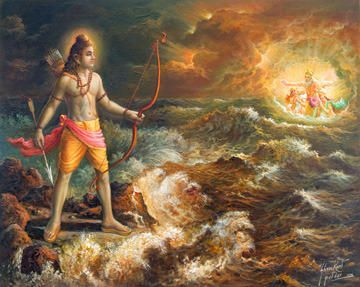 “Look at the arrogance of the lord of ocean who doesn’t manifest himself! The virtues of the good like serenity, forgiveness, honesty and sweet speech are wasted when shown to the unvirtuous. This world seems to honour an evil man who is conceitful, mischievous and dishes out punishment at will moving with his leash. O lakshmaNa, it appears like you cannot earn either fame or repute in life or victory in the battlefield by resorting to a conciliatory tone. I shall thrown the ocean and its habitants – the crocodiles, serpents, sea elephants, fish and other aquatic beings in to disarray and cut them into pieces with my arrows as you all witness. In this great battle, I will dry up the whole ocean.