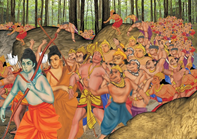 Then the gOlangUla vAnaras led by gavaksha who are terrifying and black faced and are kicking up quite a dust as they move have overseen the construction of the sEtu. They are all charged up to come and destroy lanka with their own might.