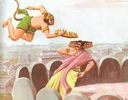 Driven by anger, substance and might, he at once leapt from the top of the suvEla peak on to the gOpuram of rAvaNa’s mansion. He glared at him from a moment without any fear whatsoever and spoke to him ina harsh and condescending manner –