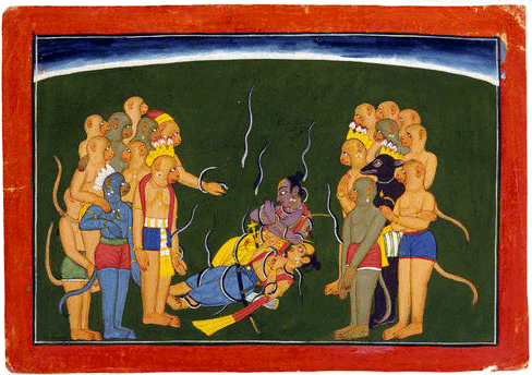 As the battle began between the determined vAnaras and the sophisticated demons, the first victory went to the vAnaras led by rAma. Against the normal conventions, the war didn’t stop by sunset since the nocturns continued their assault into the night and rAma’s army had to respond. Nevertheless, angada went after indrajit and destroyed his chariot. But that made the son of rAvaNa to disappear and use his magic to attack the enemy from the cover of invisibility. He deftly attacked the key warriors and drew the first blood for the demons as he pointed shot rAma and lakshmaNa on all their body without sparing an inch with venomous serpentine arrows and made them fall on the battle ground. The vAnaras and vibhIshaNa were devastated to behold the duo fallen thus and gathered around them. Onwards…