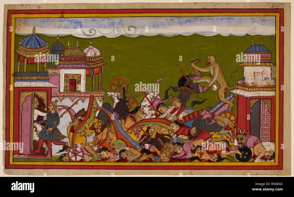 The heaps of the slain warriors formed the banks, the broken weapons resembled the trees, the livers and spleens were the mire, the severed heads were the fish, the fat formed the foam, the shrills of cries resembled gushing sounds as the river of blood flowed which was not for the cowards to cross. However, the warriors among the vAnaras and the demons criss crossed that river like elephants cross a lotus pond.