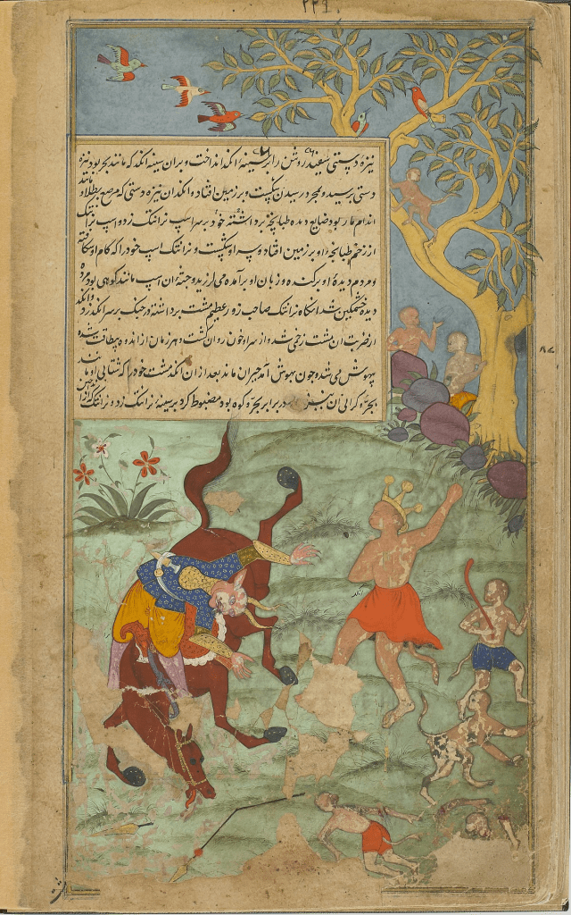 sugrIva noticed the rampaging narAntaka wreaking havoc riding the horse and the scattered and scared vAnara army. He ordered angada, who is valorous like indra – “O warrior, go at once and make this horse-riding demon who is tormenting the vAnara army bereft of life”.
