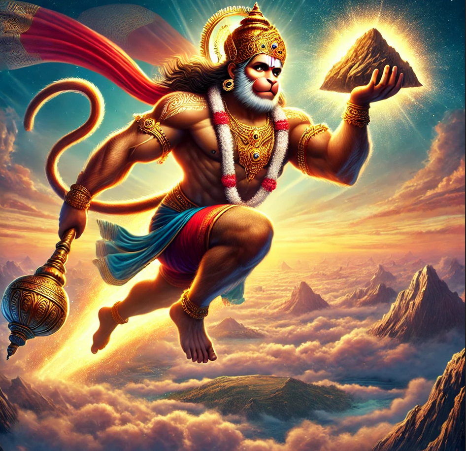 “What is this resolve of yours to not reveal the medicinal herbs. Don’t you empathise with rAghava? Then watch me humble your pride with the might in my arms and get displaced from here. Then holding the mountain at its base with his mighty arms, he lifted along with its peaks, inhabitants, minerals and everything else and holding it up leapt into the sky with great force terrifying all the words and the gods. Hailed by many celestial beings, he flew with the ferocity of garuDa. Up in the sky, the path of the lord sUrya, carrying the mountain that is effulgent like the sun, hanumAn shone like another sun by the side of the sun. He also resembled lord vishNu with the brilliant chakra in his hand.