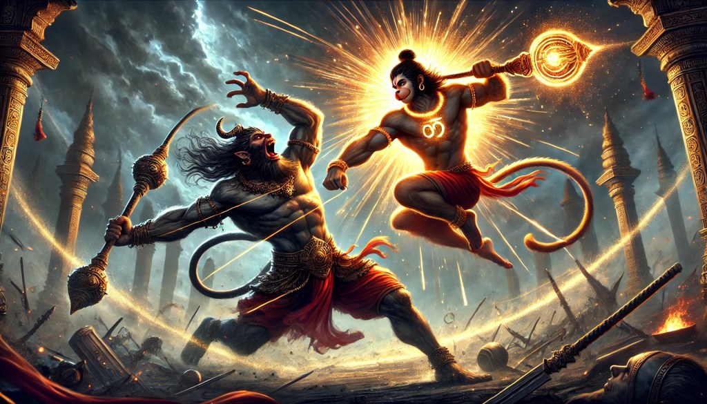 However, the mighty hanumAn squared up with him and stood facing him with his expansive chest opened up. The mighty nikumbha unleashed his great weapon parigha on the chest of hanumAn with an almighty hurl. As soon as the parogha hit the chest of hanumAn it broke into a hundred pieces and fell on the ground like a meteor in the sky! However, the great vAnara was shaken on impact of that weapon like the mountain would shake in an earthquake. The best of the vAnaras, mustered his strength and clenched his fist and threw a hard blow on the chest of the demon nikumbha. The blow was so hard that the armour of nikumbha broke into pieces and his skin split and he began to bleed. The mighty demon was shaken upon that blow. He managed to balance himself and standing firmly on the ground grabbed hanumAn and lifted him up! Although seized the son of kumbhakarNa, hanumAn nevertheless clenched his diamond like hard fist and landed another blow on nikumbha and freed himself from his clutches.