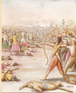 As lakshmaNa and indrajit faced off in a fierce encounter, everyone watched in awe. The two warriors were adept at war, expert archers, had a large variety of arrows at their disposal and engaged in a determined fashion. Both were keen to outdo the other. With his magical powers shorn off by the abrupt abortion of the sacrifice he was doing, indrajit was forced to fight lakshmaNa on a level playing field, or the closest it came to. While lakshmaNa was fighting perched on the shoulder of hanumAn, indrajit fought from his chariot that had all the amenities. The valour and lakshmaNa in countering indrajit was there for everyone to see. On one occasion, lakshmaNa shattered the armour of indrajit and hurt him badly. This was repaid by the son of rAvaNa in kind as he did the same. The encounter was brewing and for the first time, indrajit was under pressure and vibhIshaNa stepped in to hasten his end. Onwards…