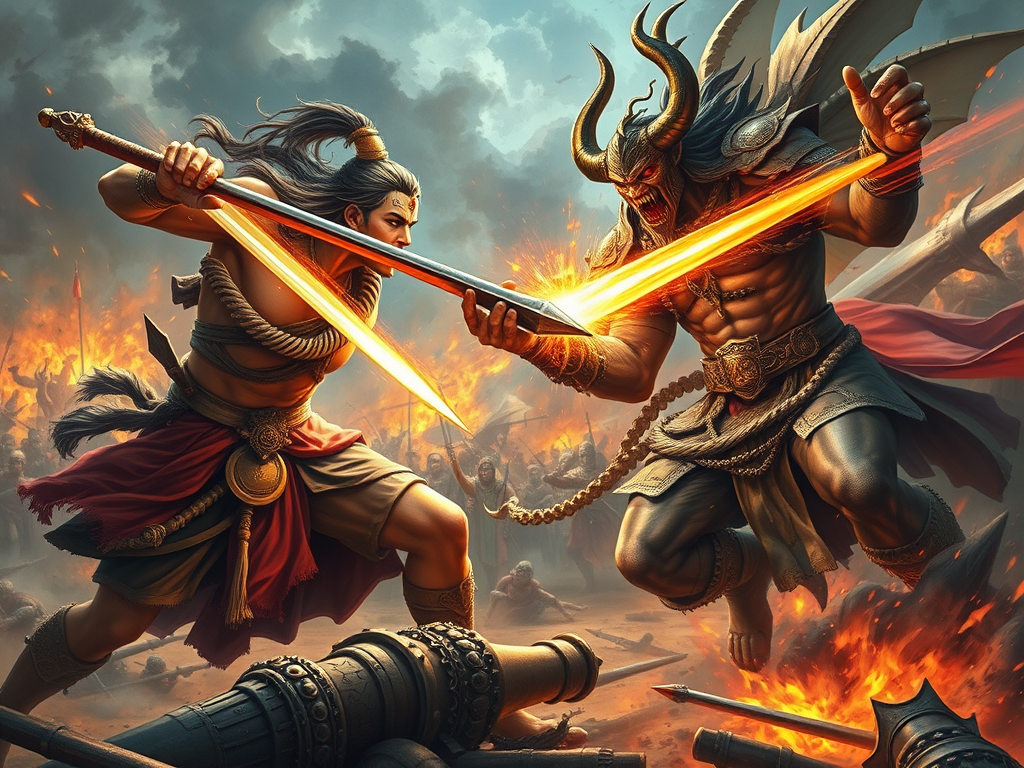 The very swift mahApArSwa, reacted sharply and taking out a large and hard battle axe that was polished with oil, majestic like the mountain and strong threw it at angada aiming at his left shoulder. Without much trouble, angada dodged that axe and clenching his fist tightly, he landed a mighty blow between the breasts of the demon aiming at his heart. Valorous like his father vAlI, angada’s blow landed like the thunderbolt of indra in the chest of the demon mahApArSwa and his heart burst at once and he fell down dead at once. The forces of the demons beat a retreat on his fall and it incensed rAvaNa a lot to see his confidant fall in the battle.