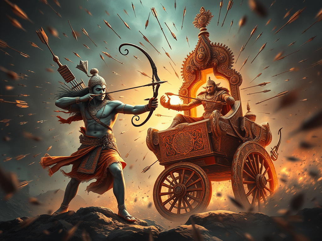 Overwhelmed and oppressed by rAma, rAvaNa, the celebrated warrior was infuriated. Reddening his eyes with anger, he brought forth his bow and rained arrows at rAma in the great battle. It was as if clouds were pouring without a break. rAvaNa hurled so many arrows at rAma that it could fill an entire lake! However, even if he was attacked relentlessly, rAma was not perturbed, just like a huge mountain treats rain with disdain, rAma also hurled the arrows back and negated the demon’s attack. Then launching a thousand arrows, rAvaNa hurt rAma on his chest. Bleeding from those hits, rAma shone like a fully bloomed kimSuka (forest flames) tree in the forest. Then, a furious rAma also hit back with extreme dexterity and a gripping battle ensued. The earth went dark as the sheer number of arrows in the skies blocked sunlight and hardly anything could be spotted.