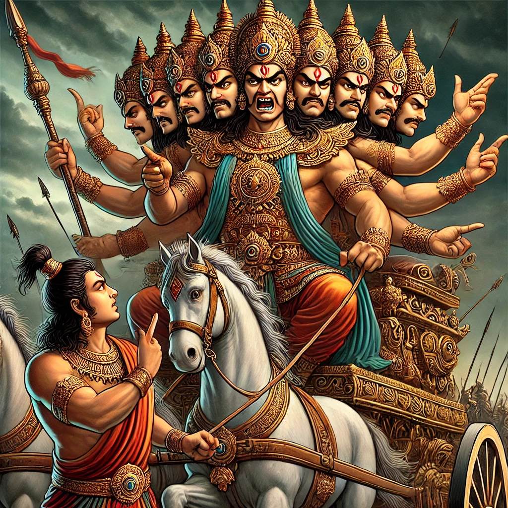 “You idiot, you have insulted me by acting on your own and showing me as an impotent, powerless, bereft of valour, an unsubstantial coward, inglorious and as if I have been deserted by my magical abilities and astras! Why did you deflect the chariot from the enemy without knowing my opinion and mortify me thus? You ignoble fellow, you have destroyed the fame, heroism, glory and trust in you that I have accumulated over a long time. You have turned me into a coward in front of an enemy who is celebrated for his prowess and heroism. You wicked one, if you do not turn the chariot back to battlefield, I shall surmise that you have been favoured by the enemy. What you have done now is done by the enemies and not by well wishers and friends.