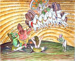 His horses are green in complexion (haridaSwa), he has infinite (sahasra) rays, his chariot is yoked to seven horses (saptasapti) and he owns the beams of light. He dispels darkness (timirOnmathana), brings peace (Sambhu), he is tvashTa and he is mArtAnDa (born of a dead foetus). He is the source of the golden glow. He is SiSira who quells the trifold griefs (caused by divine causes, bodily causes and spiritual causes). He enlightens (bhAskara). He is eulogised by all (ravi). He is the son of Aditi with fire in his inner being (agnigarbha), the dispeller of the dew (SiSiranASana) and Sankha (becomes pleasant in the evening).