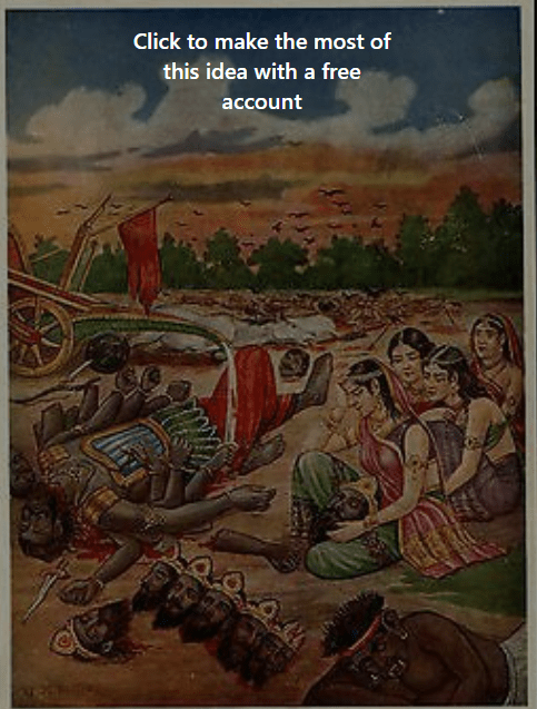 rAma fought valiantly overcoming exhaustion, counter-attack and some phases of defensive combat before he was reminded by his charioteer mAtali to deploy the brahmAstra. As he did so, the ten-headed was slain and all the worlds rejoiced! Celebrations touched the skies in the heavens while a huge pall of gloom descended on the womenfolk of rAvaNa. They came out in large numbers, searching for his mortal remains in the battlefield. As they found him, they flung themselves onto him and wailed miserably. They recalled his greatness, exploits as well as the lacunae that brought about his downfall. The younger brother vibhIshaNa who chose dharma and parted ways with him felt a lump in his throat as he fell. It was the turn of rAvaNa’s chief queen manDOdarI to see her deceased lord. Onwards…